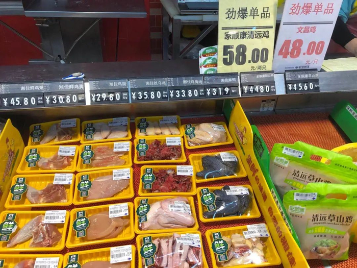 不少品牌鸡,已经不是按照多少钱一斤来买卖,而是直接按照多少钱一只来销售:中润麻鸡48元买一送一,等于48元两只,每只个头都不小,差不多两斤多一只;家顺康清远鸡也只是58元两只。据家乐福康王路店中润麻鸡的销售员介绍:“48元买一送一是周末促销价,很划算,买的人也多。还有已经处理好的大鸡腿、鸡胸肉等,也只卖9.9元一斤。”
