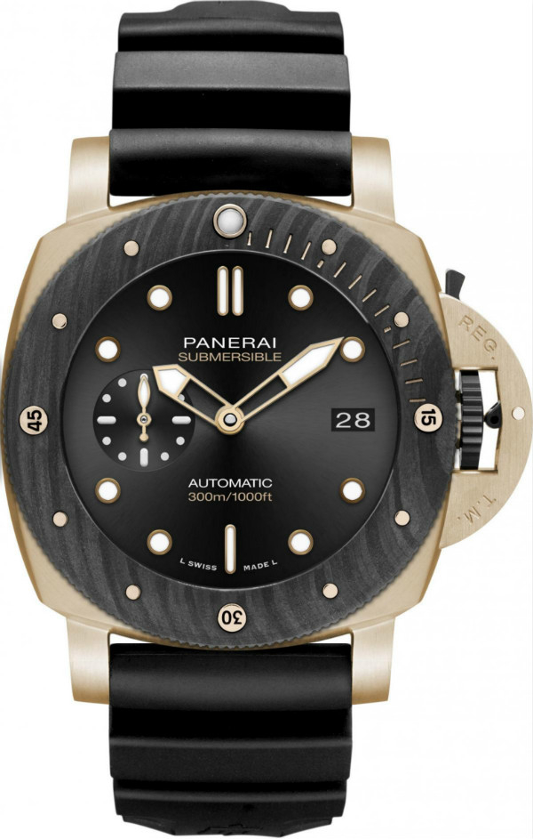 沛纳海打破惯例,融合传统与创新,首次结合两种创新材质——沛纳海Goldtech™红金和Carbotech™碳纤维,带来一枚全新Submersible潜行系列专业潜水腕表作品。这两种看似截然不同的材质碰撞出相得益彰的全新 Submersible GoldtechTM 潜行系列红金腕表 - 44毫米 (PAM01070)。新款腕表直径为经典的44毫米,巧妙地实现了优雅与动感的平衡,卓异个性由此彰显。该款腕表表壳采用沛纳海GoldtechTM红金制成,这一特殊合金采用了黄金及其他贵金属,内含铂金以及较高比例的铜,颜色鲜亮,不易氧化。腕表表盘镶贴时标,盘面以太阳放射纹润饰,这一设计在Submersible潜行系列中实为少有。