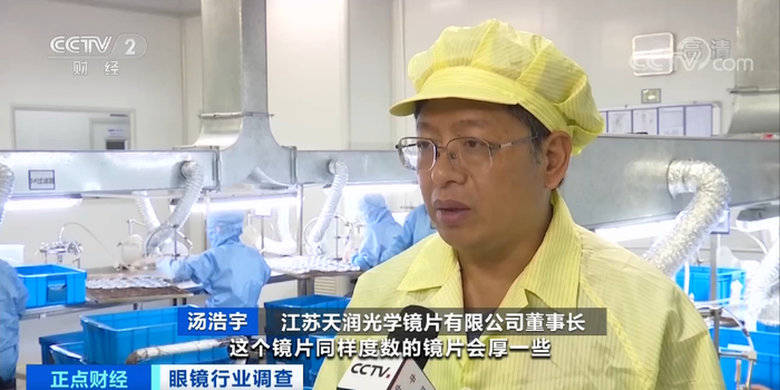 江苏天润光学镜片有限公司董事长汤浩宇:一般普通镜片折射率相对低一些,同样度数的镜片会厚一些,高档镜片材料更贵,做出来的镜片更加美观,比较薄、比较轻。工厂生产成本,一副在10元到50元左右。