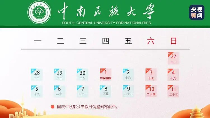 据央视新闻统计,目前,对中秋国庆假期安排,仍有学校处于观望状态,也有很多高校作出了缩短双节假期的决定,并公布了假期补课及调休时间,一些学校对寒假放假时间也作了相应调整。