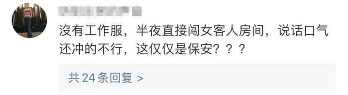 但对于为何该保安未穿保安服查房,以及为何查房,该酒店并未作出回应。据悉,女子报警后警方已对涉事男子批评教育。