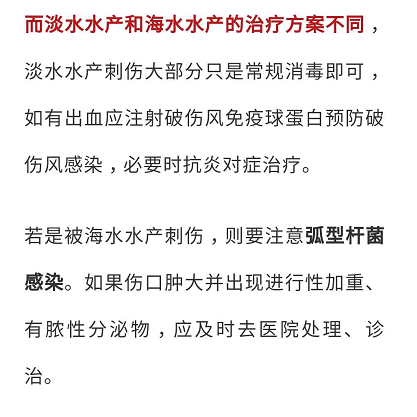 ➤ 被鱼虾刺伤尤其是海底的鱼刺伤一定要仔细消毒处理伤口,如果伤口较深还是到专业的医院处理。
