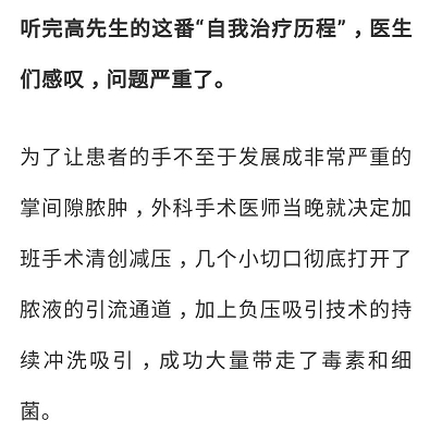 没办法就如法炮制继续排脓,如此循环往复,终于整个手掌都肿了起来,眼看先前排脓的方法不奏效了,他只能前来就医。