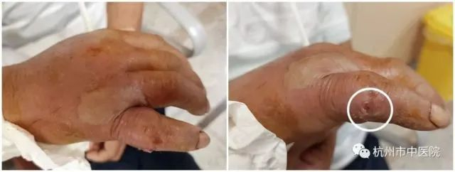 接诊的医生一看,高大爷的手臂吊着绷带,整个手掌肿的跟个大包子一样,说完全不能碰也不能动,再仔细看小拇指的内外侧各有一个横行伤口。