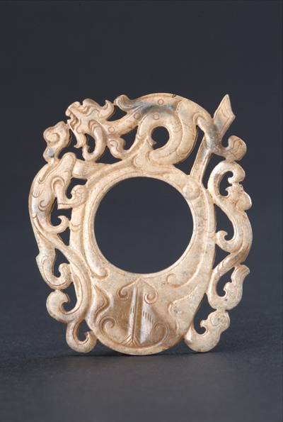 展览中这件新莽时期的玉玦,在繁复的纹样中依旧可以辨认出侧鋬,也不禁让人联想起新莽地皇四年(公元前23年)曾发生与鸿门宴剧情如出一辙的大事件:起义军所拥戴的更始帝大会诸将,计划诛杀功高盖主的刘演,先以观摩为名取下刘演佩剑。正当此时,御史申屠健献上玉玦,以佩玦催促更始帝早做擒杀刘演的决断(《后汉书·齐武王传》)。东汉史学家班固在《白虎通义》中说“能决嫌疑则珮玦。”两汉之际,佩玦依然承担着行事果断、决断的寓意。
