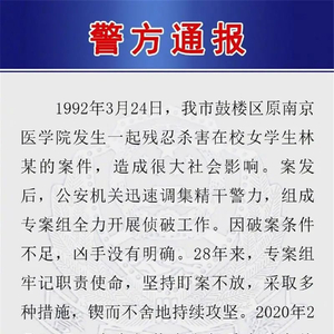 当时警方通报称,1992年3月24日,南京警方接到原南京医学院报警,称该校学生林某于1992年3月20日晚自习以后失踪。3月24日下午,林某的尸体在学校教学楼的窨井中被发现,经法医检验,死者系被钝器击伤头部,并实施强奸后放入窨井中死亡。1992年发生的"3·24"案件是南京市为数不多的恶性大案,至今仍然是全国关注的有影响的杀人案件之一。死者母亲每年3月24日或到南京或打电话到公安机关询问案件侦破进展。多年来公安部对此高度重视,历任省公安厅、市公安局党委始终高度重视案件侦破工作,主要领导、分管领导多次就加强案件侦破作出指示和部署。