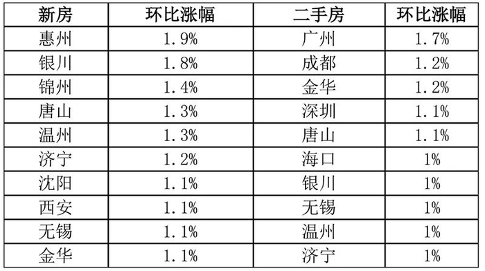 8月份,新房价格环比涨幅排名前十的城市分别是惠州、银川、锦州、唐山、温州、济宁、沈阳、西安、无锡、金华。其中,惠州新房价格环比涨幅1.9%,居全国之首;银川在市长调研房地产并召开座谈会后,新房价格环比涨幅略有回落,环比上涨1.8%,排名第二;另外,锦州、唐山、温州、济宁、沈阳、西安、无锡、金华的新房价格涨幅均超1%。