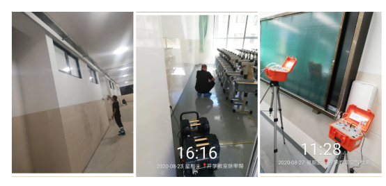 8月27日,邀请师生和家长对学校室内空气质量进行检测,教室、走廊,墙壁、地板、桌椅……任何角落都不放过。