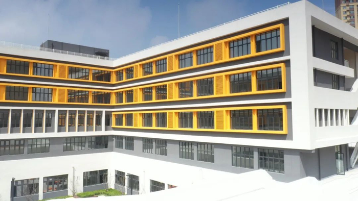 据了解,东北英才中学的教学楼采用现代主义建筑风格,外立面色彩轻松明快。学校建筑设计了多种空间形态,除却常规的操场,还设计有室内活动空间、室外露台及连廊,更有屋顶平台、地下下沉广场,可为师生活动提供不同的教学、休闲体验。