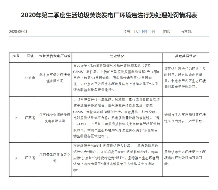 近日,生态环境部官网公布“2020年第二季度生活垃圾焚烧发电厂环境违法行为处理处罚情况表”。北京京环绿谷环境管理有限公司(以下简称“京环绿谷”)、江苏睢宁宝源新能源发电有限公司(以下简称“睢宁宝源”)和江西景圣环保有限公司(以下简称“景圣环保”)3家垃圾焚烧发电厂存在违法情况。