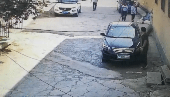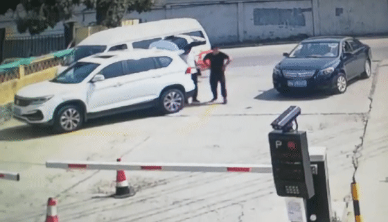 通过道闸后,男子将车停在路边,然后下车摘掉之前贴在车前方的假牌。