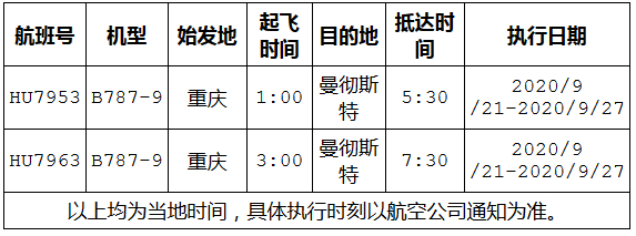 为搭建中国留学生赴英复学通道,海南航空控股股份有限公司积极响应英国23所高校包机需求,在中国驻英使领馆、重庆市政府的大力支持下,经中英两国主管部门审批,计划从9月21日起执行重庆直飞曼彻斯特包机航班。