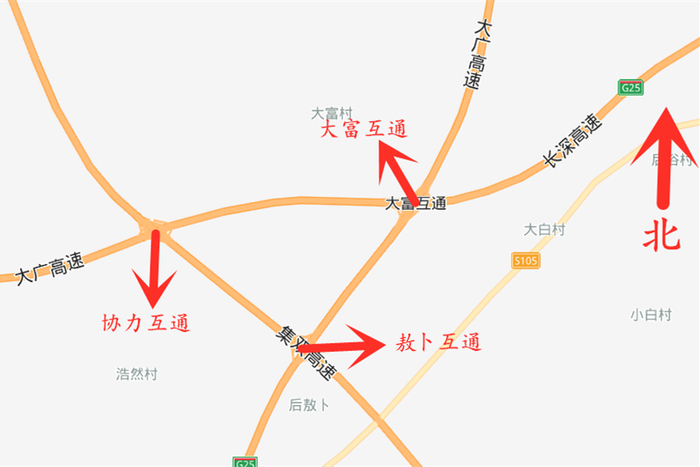 图为大广高速和双嫩高速交汇的协力枢纽互通,可不要走错路线哦!