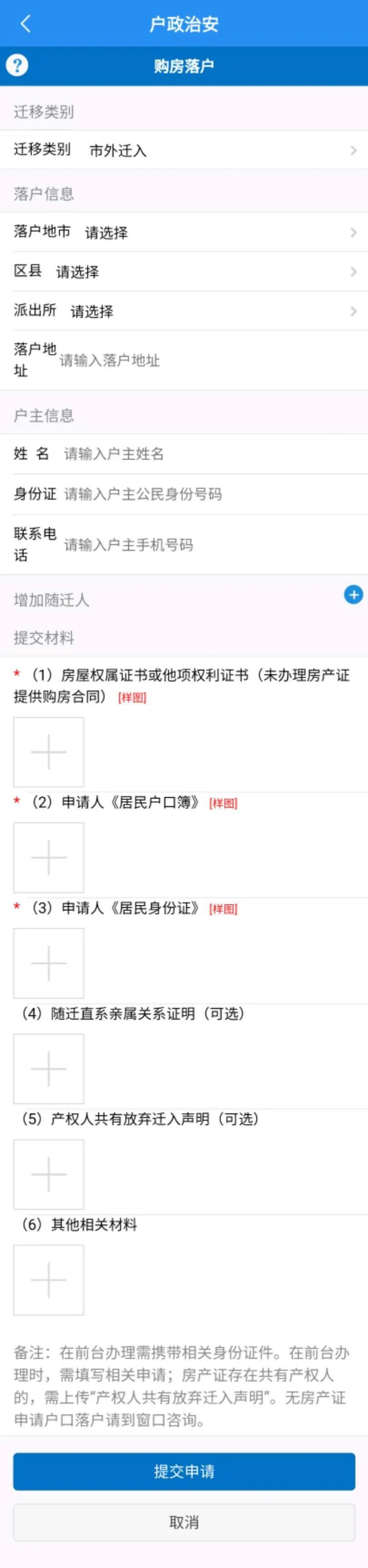 4、房产证存在共有产权人的,需上传“产权人共有放弃迁入声明”