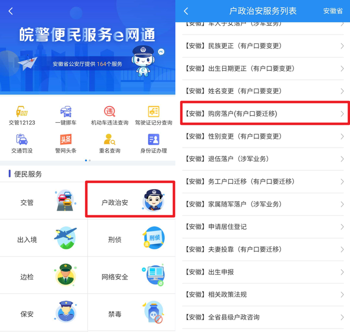 如今在皖事通“公安服务”专区,可在线办理包括夫妻投靠、父母投靠成年子女、购房落户、务工户口迁移在内的多项户口迁移业务,为用户提供安全便捷的线上户口迁移服务,有效缩短户口迁移流程,提升便民服务效率。