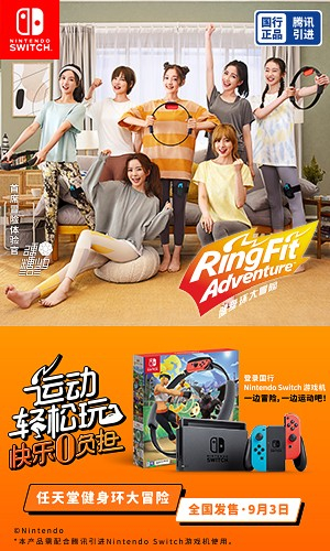 这款风靡全球的Nintendo Switch游戏《健身环大冒险》国行版,现已在Nintendo Switch京东官方旗舰店、Nintendo Switch天猫官方旗舰店以及其他授权渠道正式发售。本作将以Ring-Con、腿部固定带及游戏兑换卡同捆套装的形式发售,官方建议零售价499元。