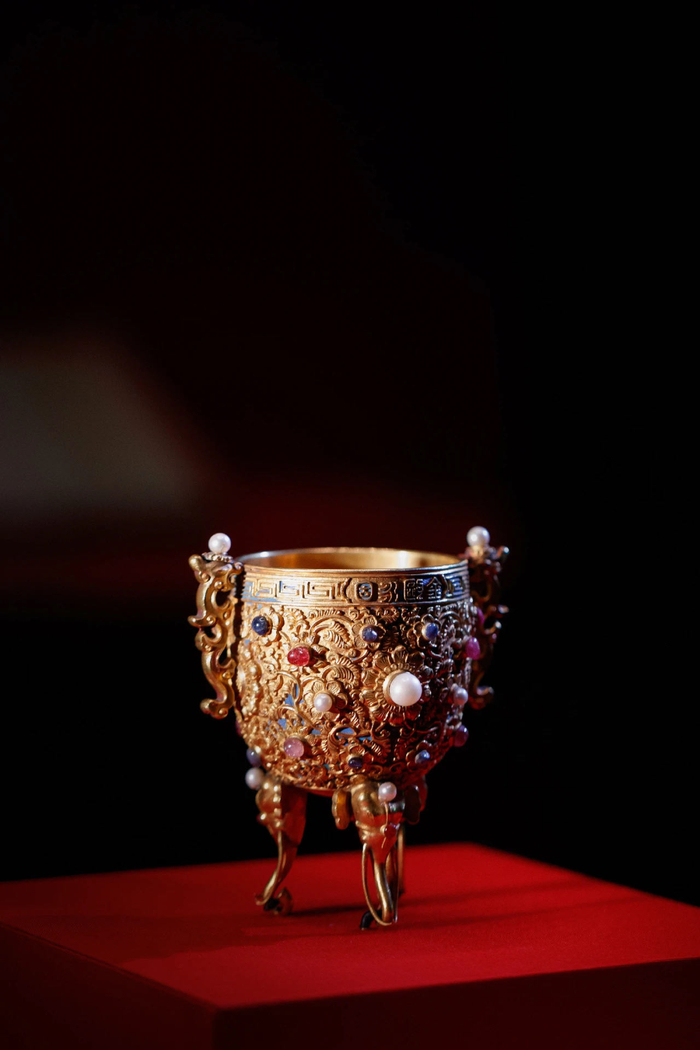 ▲图为2020年9月10日,紫禁城建成六百年展览中展出的金瓯永固杯。图片来源:微故宫