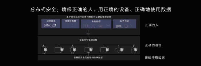 实则是确保正确的人,用正确的设备获取正确的数据。正确的人,保证使用者是设备的主人,现在的指纹识别或者面部识别,都是单维度认证,未来华为将采用多维度认证,确保使用者是设备的主人。正确的设备,则是一方面保证单设备本身是安全可靠的。另一方面则是指设备间建立的连接是安全可靠的,保证设备不被攻破不被仿冒。正确的数据,则是对数据进行分类分级的全生命周期保护,即通过定义数据级别采取对应的处理方式,围绕数据在产生、存储、使用和传输过程中,对数据进行全生命周期保护,确保用户正确的使用数据。