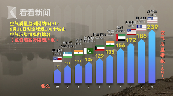 根据空气质量监测网站IQAir9月11日对全球近100个城市的空气污染情况的排名来看,美国俄勒冈州波特兰市以239的整体空气质量指数(数值越高代表污染越严重)高居榜首,成为全球空气质量最差的城市,而西雅图、旧金山和洛杉矶也位列空气质量最差的倒数10名之中。美国环境保护署网站列出的波特兰的空气质量指数甚至更高,达到349。