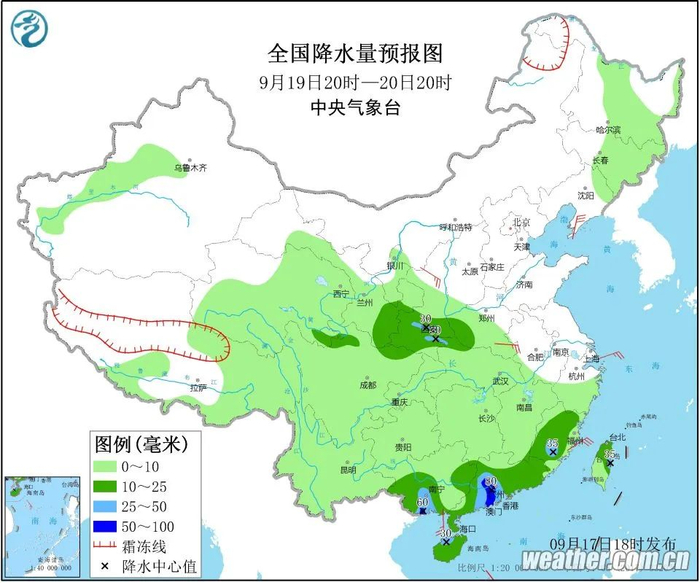 受西风槽东移和副高外围暖湿气流共同影响,预计9月19日夜间至22日西安市有一次大范围降水过程,过程累计降水量 20~50毫米。