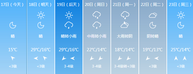 今天晚上到明天白天:晴间多云,15~29℃;