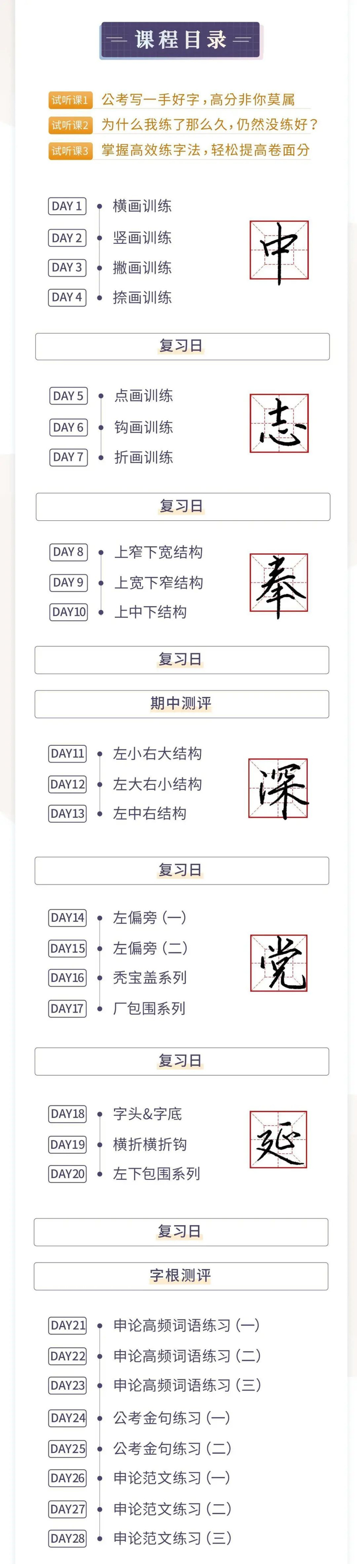 1. 告别写字慢,写字丑:通过28天训练营逐级进阶,掌握写好字的核心方法论。从高频字举一反三,应对到常用2500字的书写;