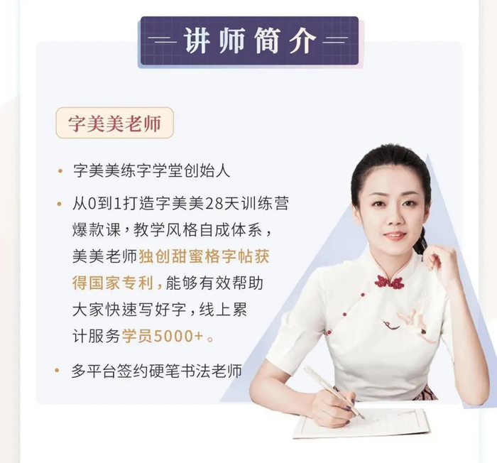 美迪老师经过多年潜心研究练习,独创了一套完整高效的练字体系,抛弃传统练字的田字格和米字格,独创了“甜蜜格”的字美美专业字帖,已申请国家专利保护。课程没有枯燥的书法理论,只要28天,你的字就会有翻天覆地的变化。