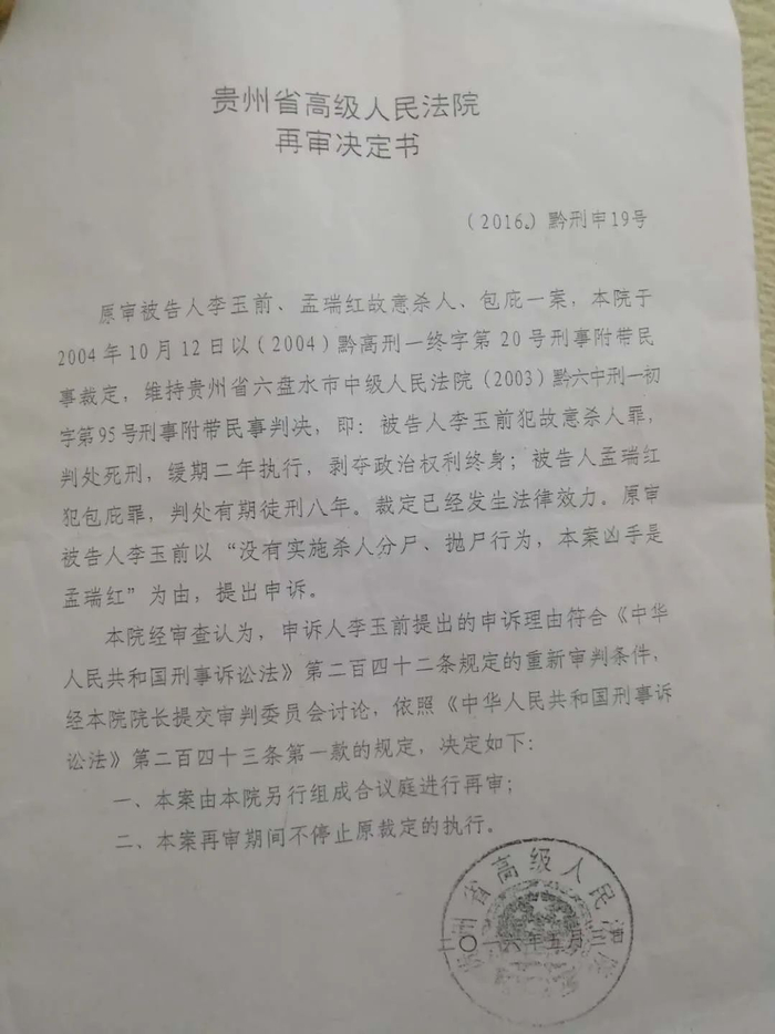 本案于2001年9月10日由六盘水市中级人民法院一审作出刑事判决书,李玉前与孟艳红均不服该判决上诉至贵州省高级人民法院,贵州省高院于2001年11月20日以“原判认定事实不清,证据不足”为由,发回重审。六盘水中院重审一审仍认定李玉前杀人焚尸,李玉前不服上诉后,贵州高院维持一审原判。