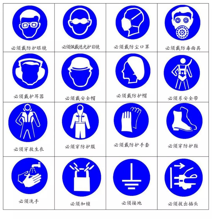 指令标志是强制人们必须做出某种动作或采用防范措施的图形标志。指令标志的几何图形是圆形,蓝色背景,白色图形符号。