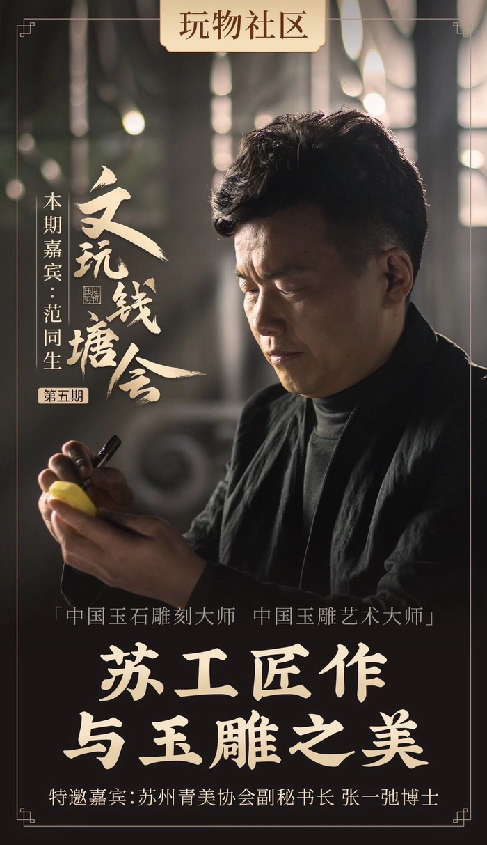 此次做客《文玩钱塘会》直播间的大师范同生是新一代玉雕大师中的代表人物。1994年,范同生只身一人前往苏州拜师学艺,专攻苏作玉器工艺,历经10年的磨练,2003年他看准玉器市场的发展潜力,开始创业,开办了文同轩玉雕工作室,并持续开展教学培训,传承苏州玉雕技艺。在继承传统的基础上,范同生还有自己新的创意,他的作品风格不拘一格,构思巧妙,神形兼备,既有中国传统木雕、石雕的刀法,又有西方现代雕塑的构图,是传统与现代的完美结合。