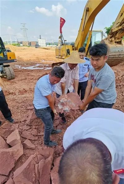 接到报警后,当地派出所迅速赶往现场,陆续数天收缴了部分散落在工地上完整的恐龙蛋化石共计24枚及部分不完整的蛋壳碎片。河源恐龙博物馆和中国科学院古脊椎动物与古人类研究所派出文博人员及专家,先后于今年6月至8月共4次赶赴发掘现场,对实施爆破的山坡进行抢救性保护发掘,又先后发掘出数窝窝状恐龙蛋化石,其中嵌在红砂岩土块、肉眼可见完整的恐龙蛋化石9枚,同时出土有不完整的恐龙蛋蛋壳及蛋碎一批。