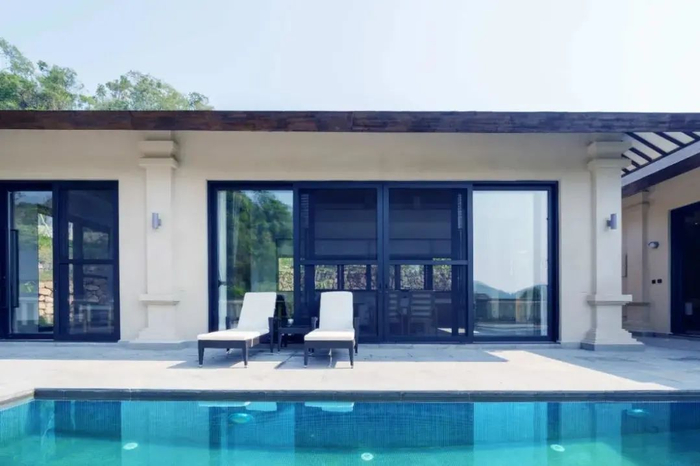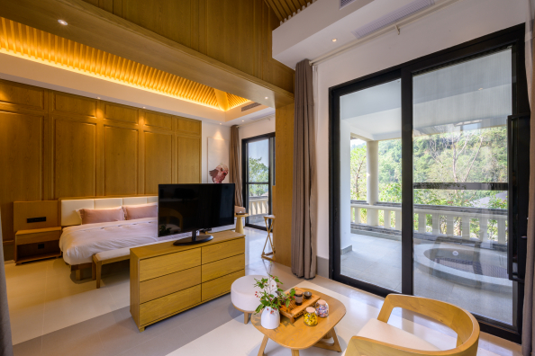 泳池套房的设计简洁却处处透露着设计者的用心,客厅和卧室的细节巧妙融合了中式的禅意和日式的侘寂之美,质朴中满满渗透了用硬件打造的舒适感。