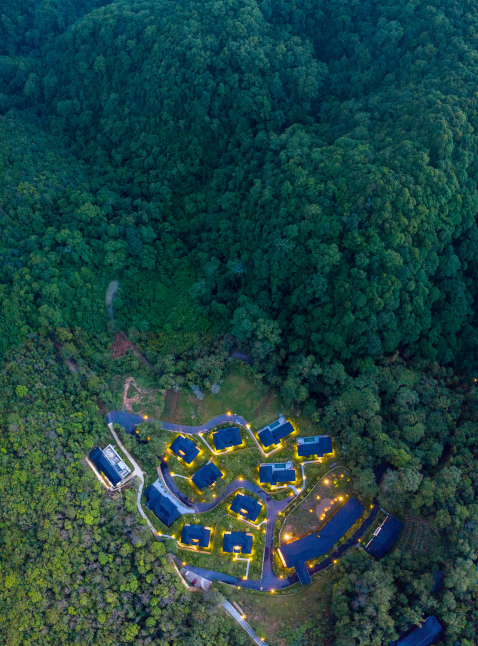 让旅居的人们,入眼即是森林,枕卧伴随着远山小涧潺潺流动的水流声、枝藤上翅羽欢悦而啭的莺燕声,亦或是昼夜起伏不断的惬然虫鸣。