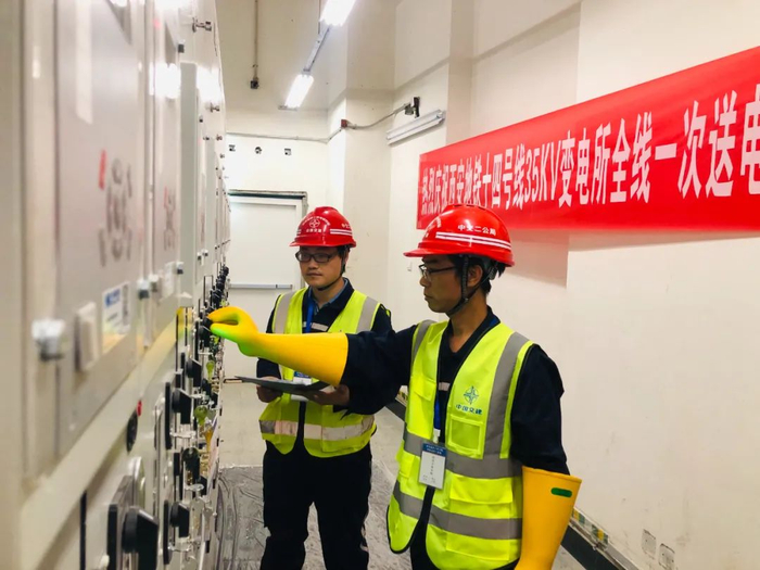 “合1041B隔离开关,再合104B断路器,2号动力变受电!”9月18日15时许,随着贺韶村站变电所送电操作人员的一声指令,地铁14号线完成了对最后一台变压器的带电冲击。至此,西安地铁14号线顺利实现全线“电通”,为车站提供动力的“心脏”开始跳动。