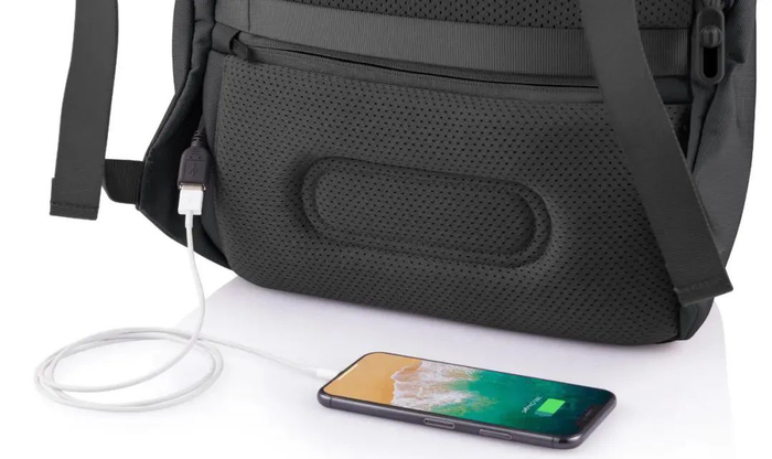 为了照顾到充电线的长度,充电口设计在背包的右下方,普通充电线的长度足够能用!