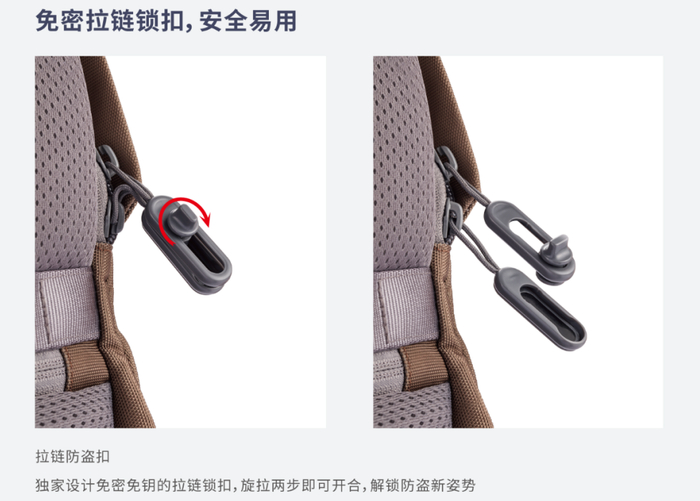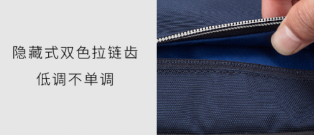 其次,拉链抛弃传统的密码锁口等防盗设计,而是采用更加方便的免密式拉链锁扣。