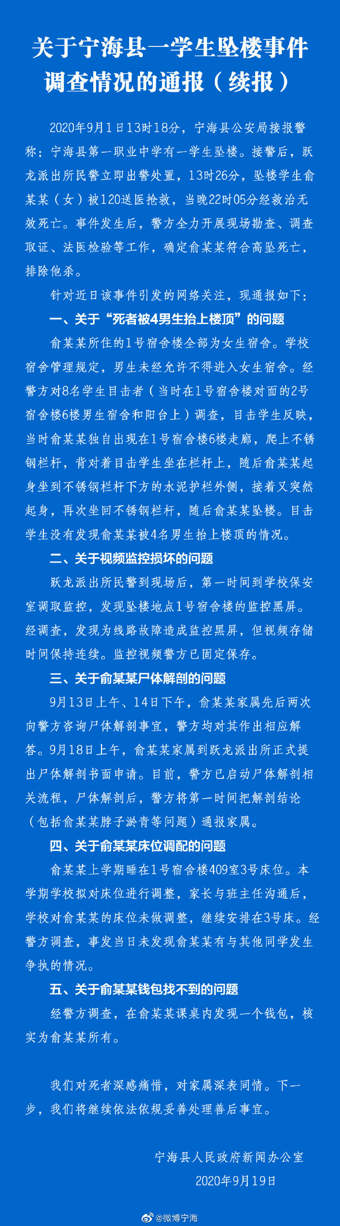 中新网9月19日电 据浙江宁海县委、县政府官方微博消息,针对宁海县一女学生坠楼事件,该县政府新闻办19日发布通报称,2020年9月1日13时18分,宁海县公安局接报警称:宁海县第一职业中学有一学生坠楼。接警后,跃龙派出所民警立即出警处置,13时26分,坠楼学生俞某某(女)被120送医抢救,当晚22时05分经救治无效死亡。事件发生后,警方全力开展现场勘查、调查取证、法医检验等工作,确定俞某某符合高坠死亡,排除他杀。