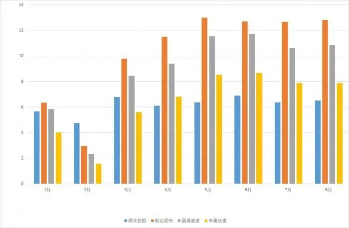 当8月份的经营数据公布之时,顺丰、韵达、圆通、申通等四家A股快递上市公司的市场份额也得以浮出水面。