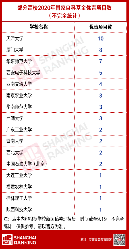其中大家最关心的优秀青年科学基金项目,目前还未公布完整名单,但已有高校官宣了学校的情况,软科(ID:zuihaodaxue)小编特意搜集汇总,供大家参考(为不完全统计):