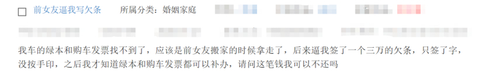 如果你与前女友之间不存在借款事实,而是你前女友胁迫你签三万元的欠条,那么前女友以绿本(机动车登记证)和购车发票为要挟,迫使你违背自己的真实意愿在三万元的欠条上签字,从法律上来说,你前女友的行为已经构成胁迫。根据《民法总则》第一百五十条、第一百五十二条,以及《合同法》第五十四条的规定,一方以胁迫手段,使对方在违背真实意思的情况下实施的民事法律行为,受胁迫方有权请求人民法院或者仲裁机构予以撤销。同时,撤销权应在当事人知道或者应当知道撤销事由之日起一年内行使,因此,你应自签署欠条之日起一年内,提供你受胁迫签欠条的证据向法院提起撤销之诉,请求法院撤销该欠条。