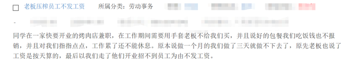 我和同学在一家快要开业的烤肉店兼职。期间,我们需要用手套工作,但老板不给我们买;并且之前说好的包餐,但现在老板不给我们报销吃饭钱,并且对我们指指点点,工作累了还不能休息。原本说做一个月的我们做了三天就做不下去了,原先老板也说了工资是按天算的,但最后他却以我们走了、他们开业招不到员工为由不给我们发工资。请问我和同学该怎么办?