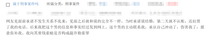 原标题:承诺结婚又拉黑我,我在网上曝光他,他又想弥补我,我向其索赔构成敲诈吗?