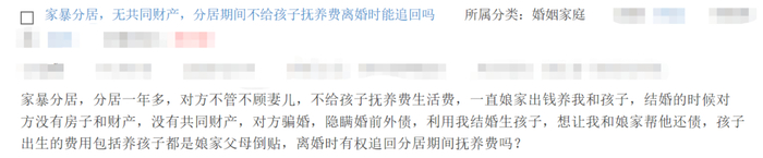 因为家暴,我和丈夫分居。现在分居一年多,对方对妻儿不管不顾,不给孩子抚养费和生活费,一直是由娘家出钱养我和孩子。之前结婚的时候,对方没有房子和财产,没有共同财产。对方骗婚,隐瞒婚前外债,利用和我结婚生孩子,想让我和娘家帮他还债,孩子出生的费用包括养孩子的费用都是我娘家父母倒贴。请问我们离婚时,我有权追回分居期间的抚养费吗?