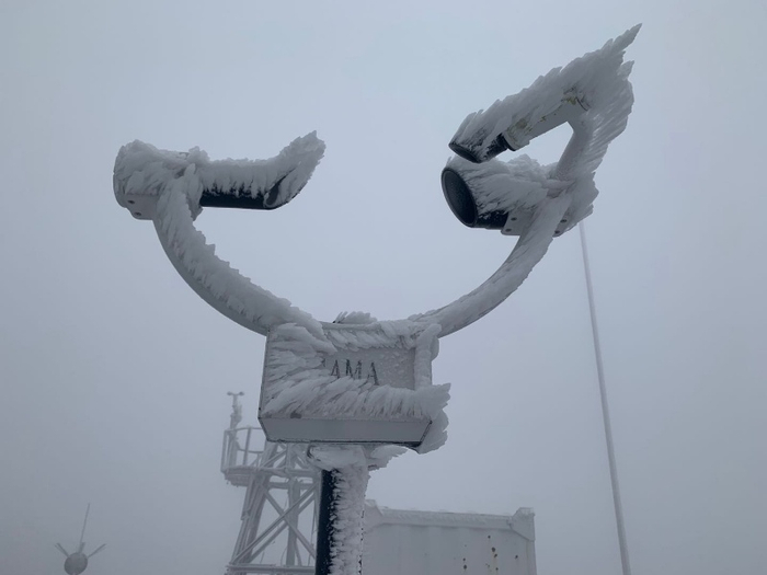 长白山天池气象站工作人员在清除仪器设备的积冰