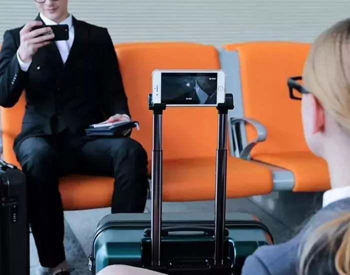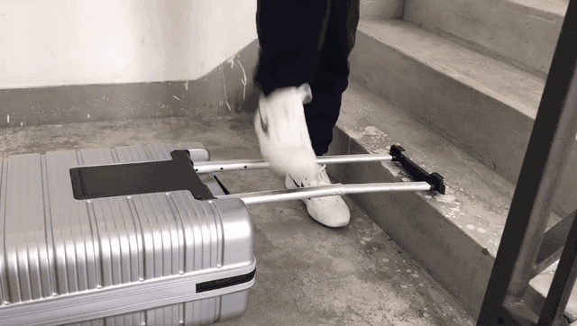 箱子拉杆上设计成支架形状,可以伸缩,解放双手的同时,甚至能边刷剧边补餐。
