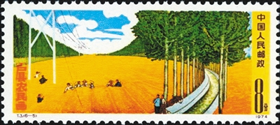 1957年12月30日发行的《农业合作化》特种邮票,其中第四枚“丰收”,画面以多层次的结构表现了整个丰收场面。前景主图一位合作社女社员正在脱谷机前熟练而专注地操作着;中景处,几位男社员们正在紧张地将粮食装进粮袋;远处背景则是堆积如山的粮食。金黄的色调烘托出了农业丰收的喜人景象;1959年9月25日发行的《人民公社》特种邮票,其中第三枚“农”,图案中一位人民公社女社员怀抱着一大捆麦子,象征农业大丰收;1964年3月8日发行的《人民公社女社员》特种邮票,其中第二枚“粮食丰收”,图案中一位女社员正在收获小麦,其辛勤的汗水换来丰硕的成果,让她洋溢着喜悦的表情;第三枚“棉花丰收”,图案为一位女社员正在采摘棉花的场面;第四枚“果子丰收”, 图案中两位女社员正在繁茂的果林采摘水果;1964年9月26日发行的《知识青年在农村》特种邮票,其中第一枚“收割”, 图案表现了知识青年丰收季节在田间收割谷物的情景;1974年4月10日发行《户县农民画》特种邮票,其中第五枚“林茂粮丰”,图案描绘的是一条绵长防风林带的两侧是金色的田野,显现出一派丰收的壮观景象;第六枚“金山银海”,图案表现了粮棉大丰收的宏伟场景:金黄的玉米堆积如山,雪白的棉花晾晒似海,辛勤劳作的人们沉浸在丰收的喜悦之中;1974年9月30日发行《大寨红旗》特种邮票,其中第四枚“大丰收”,图案中一辆辆行驶的大解放汽车满载着粮食,背景画面农民在打谷场上晾晒粮食和谷物脱粒,一派繁忙景象;1974年10月1日发行《中华人民共和国成立二十五周年(第二组)》纪念邮票,其中第二枚“农业学大寨”,图案是一位女社员面带丰收的喜悦,把粮食装进麻袋。