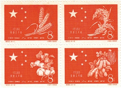 1959年4月25日,邮政部门发行《1958年农业大丰收》纪念邮票,全套4枚印制成“田”字形四方联,每枚图案画面均以五星红旗为衬托,上面绘有一种或几种农作物。图案分别为“麦”“稻”“棉花”和“大豆,花生,油菜”,这也是邮政发行的表现农业大丰收的一套专题邮票。