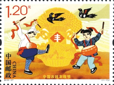 9月22日是二十四节气的秋分,也是第三个中国农民丰收节。2018年,经党中央批准、国务院批复,将每年秋分日设立为“中国农民丰收节”,为纪念我国首个农民丰收节,2018年9月23日,即当年的秋分,中国邮政发行一枚《中国农民丰收节》纪念邮票,图案表现了我国劳动人民在金秋时节庆祝农业丰收的场景。画面中一对年轻的农民夫妇在丰收的黄土地上舞动着手中的鼓棒欢快地舞蹈。在他们背后,丰收的庄稼溢满贴着“丰”字的粮仓,空中飞来的喜鹊更是增添了丰收的喜庆氛围。画面远处表现了南方的梯田,前景与背景相互呼应,形成了一幅全国上下“庆五谷丰登、享丰收喜悦”的美好画面。