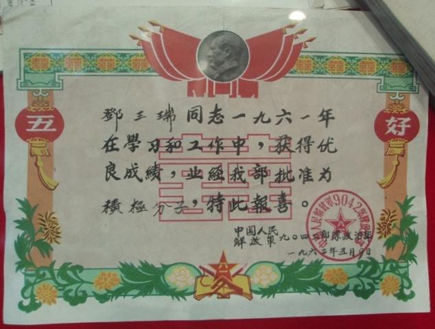 1962年5月,解放军9042部队颁发给邓三瑞的喜报