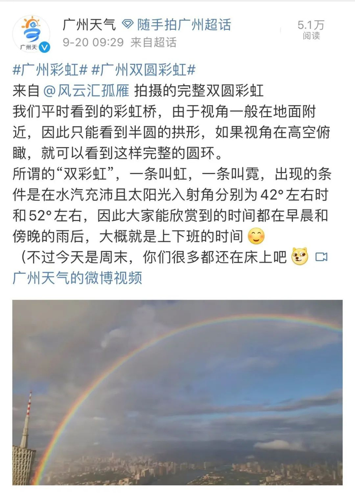 靓爆镜!今早广州上空惊现双圆彩虹